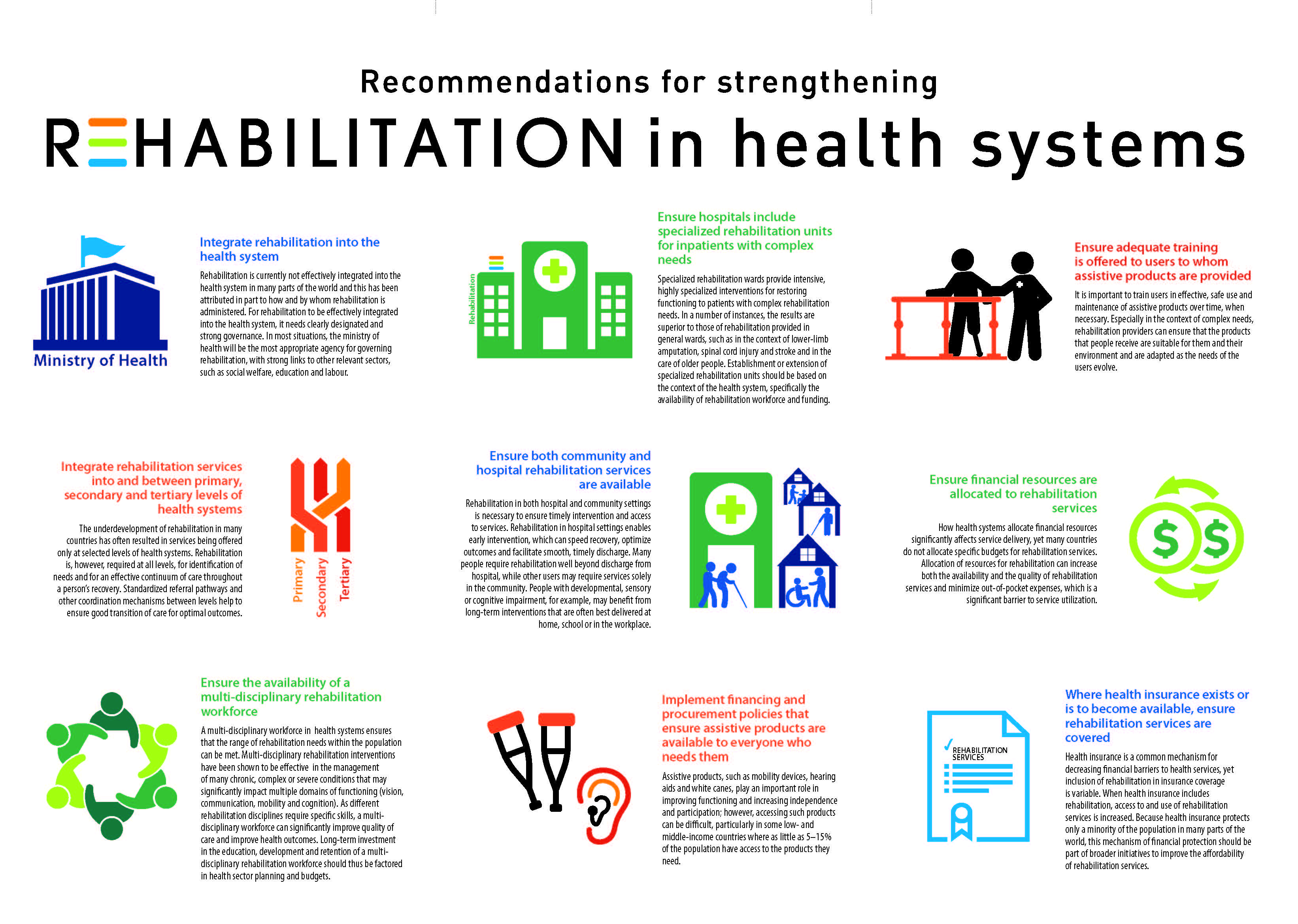WHO publitseeris 2017. aastal dokumendi “Rehabilitatsioon tervishoiusüsteemides” (inglise keeles “Rehabilitation in Health Systems”) ning seal soovitatut toetava keskpika eesmärkide ning nõuannete kogu “Rehabilitatsioon: kutse tegudele 2030” (inglise keeles: “Rehabilitation: a Call to Action 2030”).