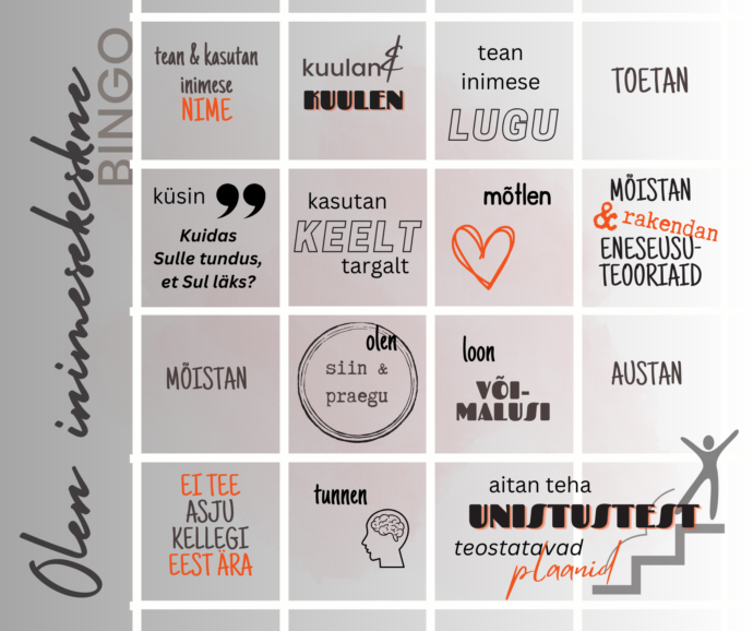 Vana aasta on kokkuvõtete tegemise aasta. Ja enesesse vaatamise aeg. Olgu siis seekordne blogipostitus soodne kahes vaates: esiteks, lühike, et muudeks asjadeks jääks rohkem aega ning, teiseks, võimaldaks mõelda enda tegemiste peale – kas oled inimesekeskne. Vaata selleks otstarbeks koostatud väikest BINGOT – mõtle, kuidas Sul läheb, sea uueks aastaks eesmärke, et läheks paremini ja naudi head uut inimesekesksete tegemiste aastat!