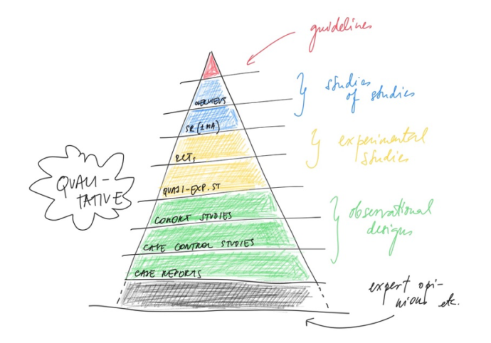 Tõenduspõhise praktika juured on tõenduspõhise meditsiini küljes, mis omakorda tähendab suuresti – küll mitte ainult – ravimuuringuid. Viimased alluvad hästi klassikalisele tõenduspõhisuse püramiidile, mille joonise olen siia paremale lisanud ning mille tipus troonivad randomiseeritud kontrolluuringud ja süstemaatilised analüüsid.