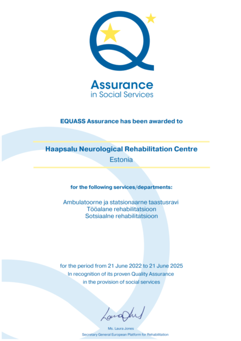 Taaskord oleme hinnatud Euroopa kvaliteedisüsteemi EQUASS Assurance tunnustuse vääriliseks ning omandanud selle tõenduseks EQUASS-i peakontori (European Platform for Rehabilitation) poolt Belgias, Brüsselis väljastatud vastavasisulise sertifikaadi.