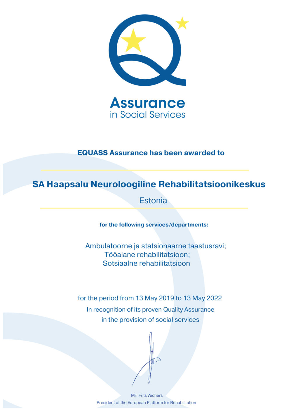 13.05.2019 otsustas EQUASS-i peakontor (European Platform for Rehabilitation) Brüsselis, et oleme taaskord kvaliteedisüsteemi baastaseme EQUASS Assurance kohaselt sertifitseeritud. Tunnustuse näol on tegemist sotsiaalteenuste kvaliteedimärgiga Euroopa tasandil ning selle saamise aluseks on EQUASS 2018 Standardi nõuetega vastavuses olemine ja vastavuse tõendamine.